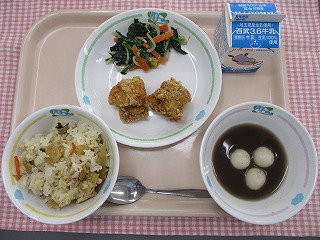 | 1月12日 (水) こぎつねずし からあげ ほうれん草の胡麻味噌あえ 白玉ぜんざい ![]() ![]() |