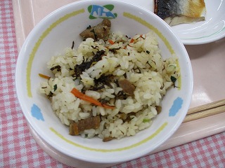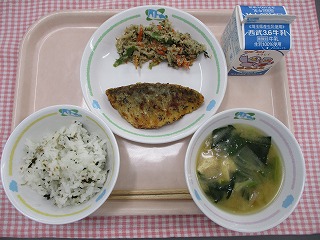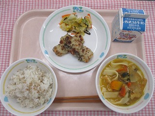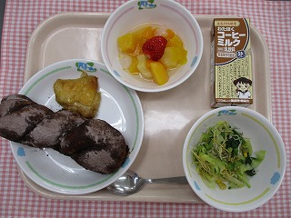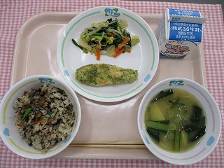 | 1月25日 (火) ひじきごはん 笹かまぼこの磯部揚げ ほうれん草の胡麻和え さつまいもと小松菜の味噌汁 ![]() ![]() |