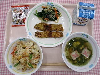 3月9日 (水) わかめごはん 鯵の梅揚げ 卯の花の炒り煮 ほうれん草とじゃがいもの味噌汁 ![]() ![]() |