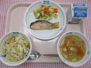 | 2月7日 (月) ガーリックピラフ さけのムニエル マカロニサラダ 白菜のスープ ![]() |