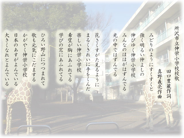 みどりのように すくすくと 強く 明るい 仲よしの 伸びゆく 伸栄 小学校 みんなのほほが はずんでる 光の中で はずんでる 花さくすがた 見るように まるく きれいに手をくんだ 楽しい 伸栄 小学校 希望が胸に あふれてる 学びの窓に あふれてる ひろい野山に つつまれて 歌も 元気にこだまする かがやく 伸栄 小学校 日本のあすが よんでいる 大きくなれと よんでいる